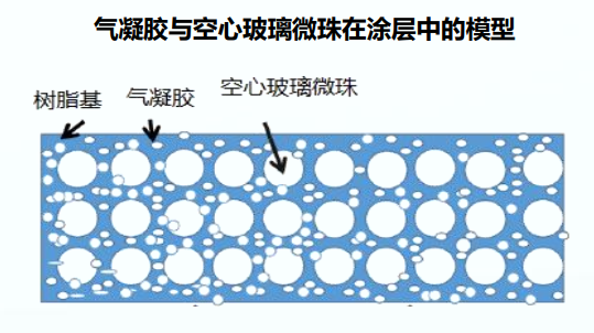 Additionally, hollow glass microspheres can be used in conjunction with aerogel to synergistically improve coating performance and reduce raw material costs. The synergistic effects of hollow glass microspheres and aerogel in thermal insulation coatings are illustrated in the diagram below.